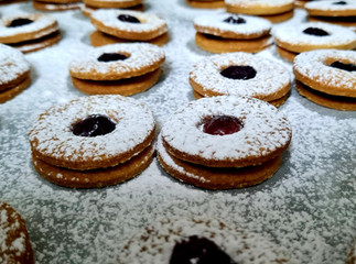 מפזרים אבקת סוכר עם מסננת על העוגיות עם החור האפויות,